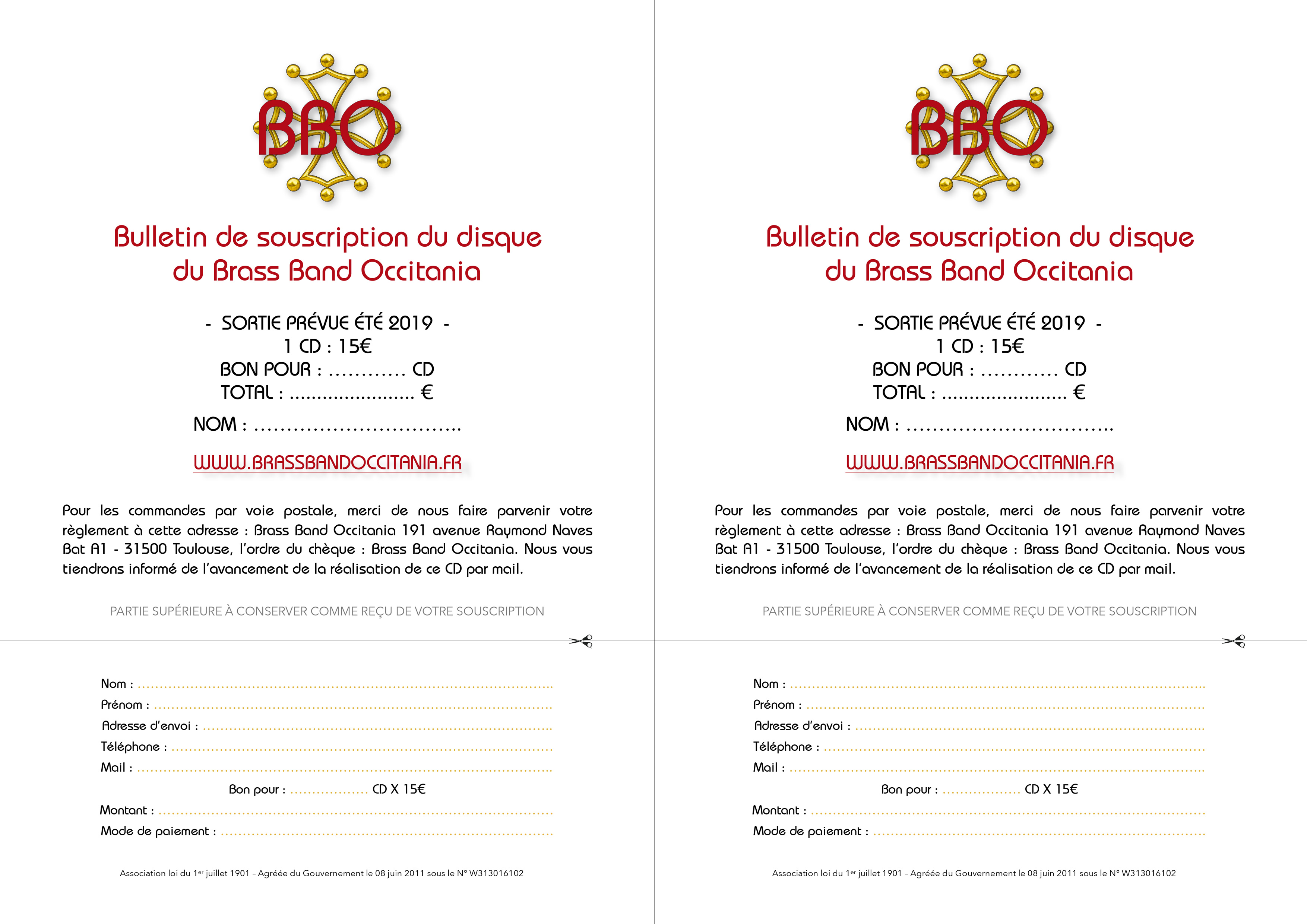 - Envoyez-la nous avec votre règlement par chèque à l’ordre du « Brass Band Occitania »à l’adresse :